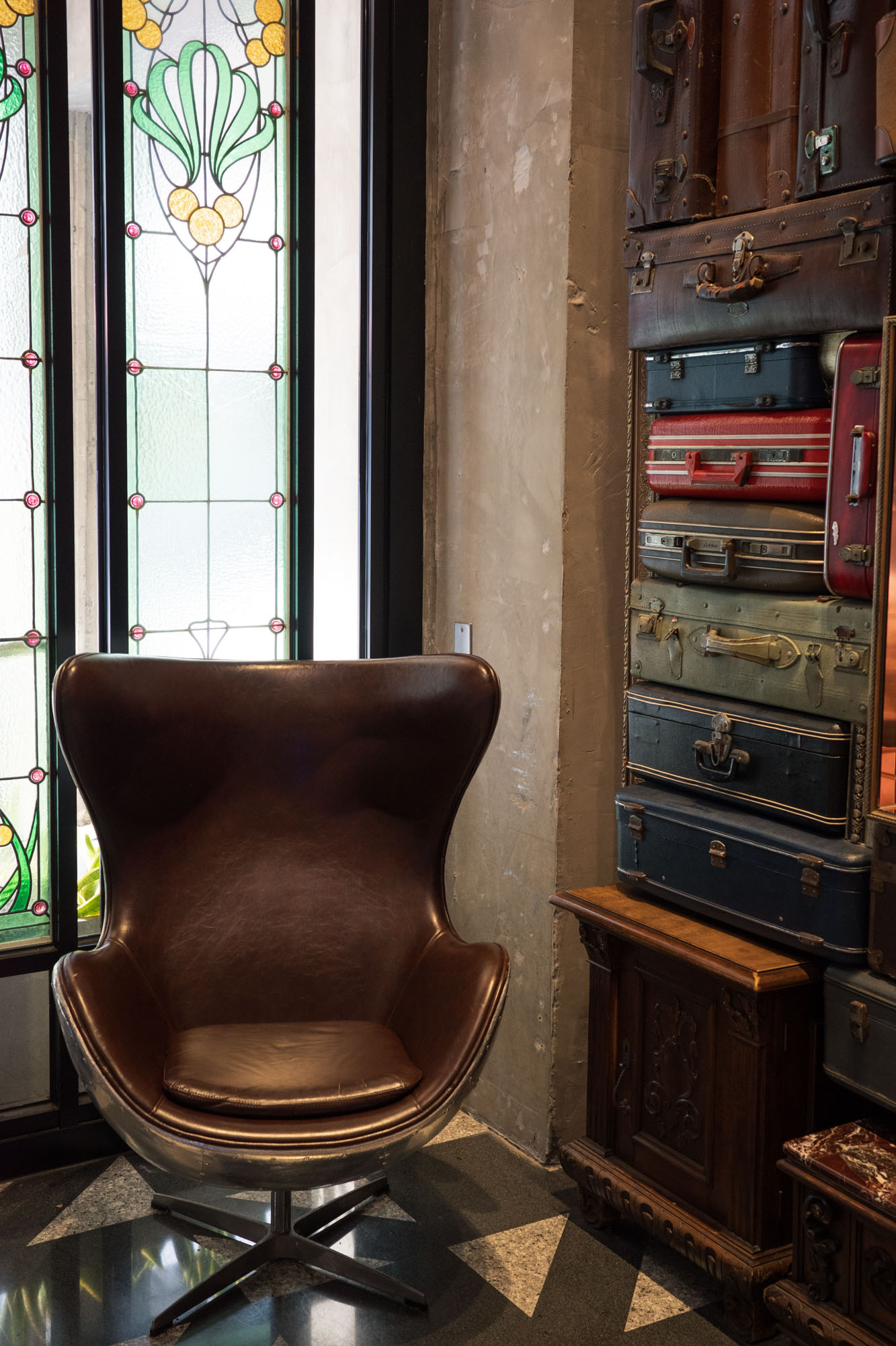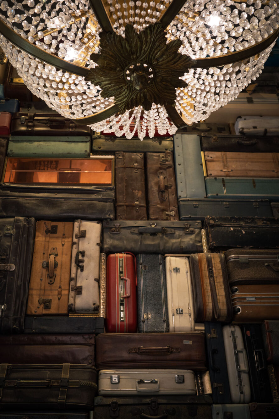 壁一面トランクケースのオブジェ。